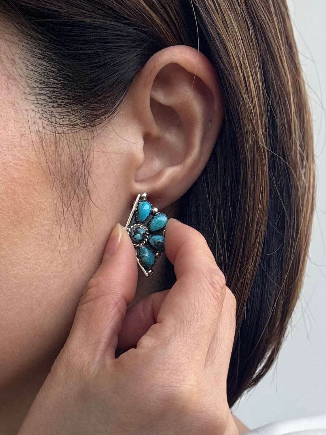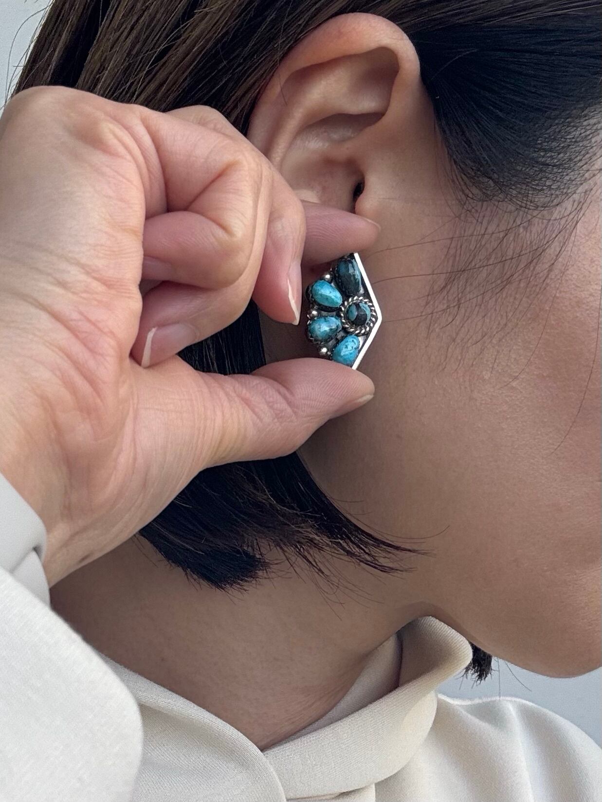 ターコイズのお花を半分ずつ両耳に着けているようなオシャレで可愛いらしいデザイン。