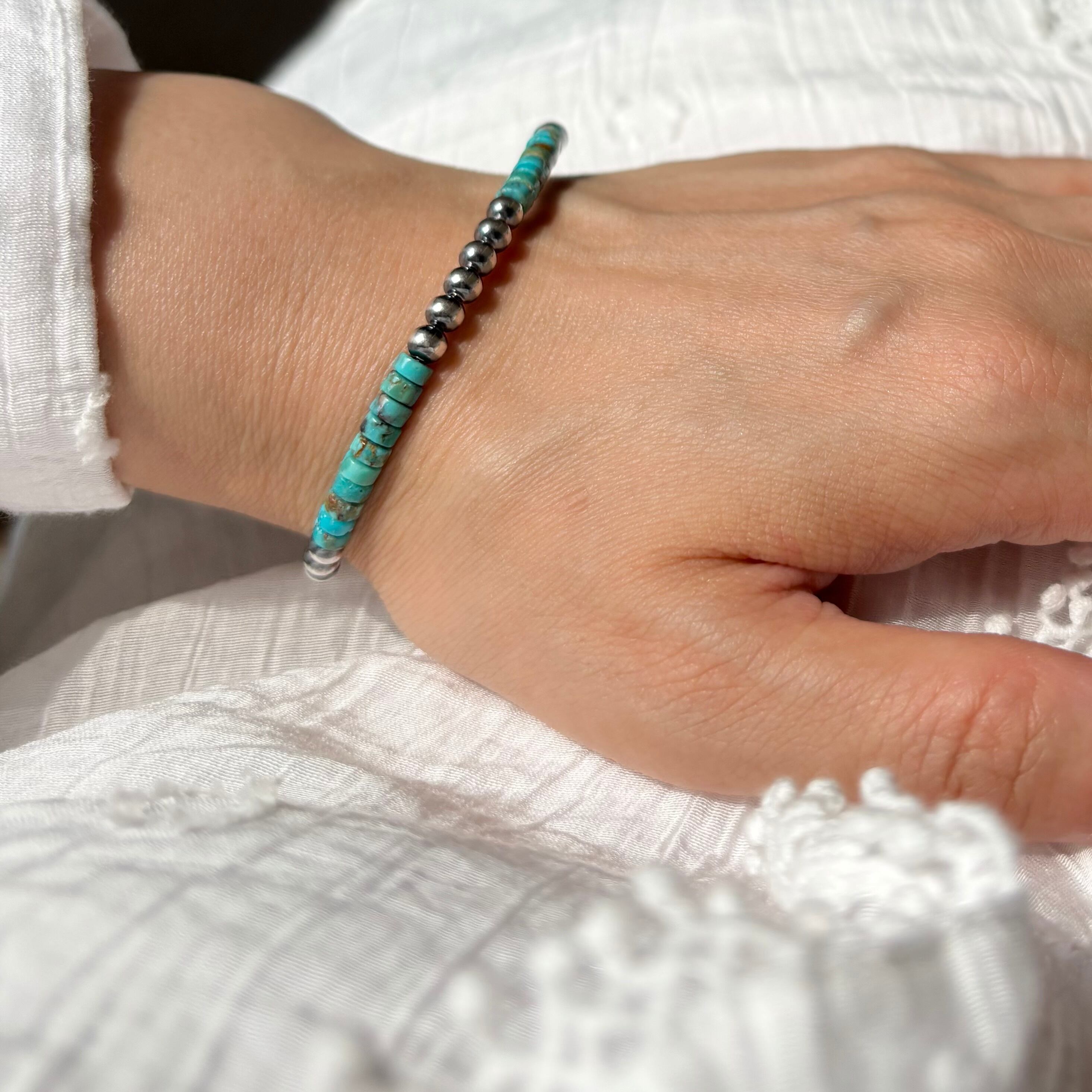 ナバホパールとターコイズヒシビーズが等間隔にミックスされた、唯一無二の存在感を放つデザイン。