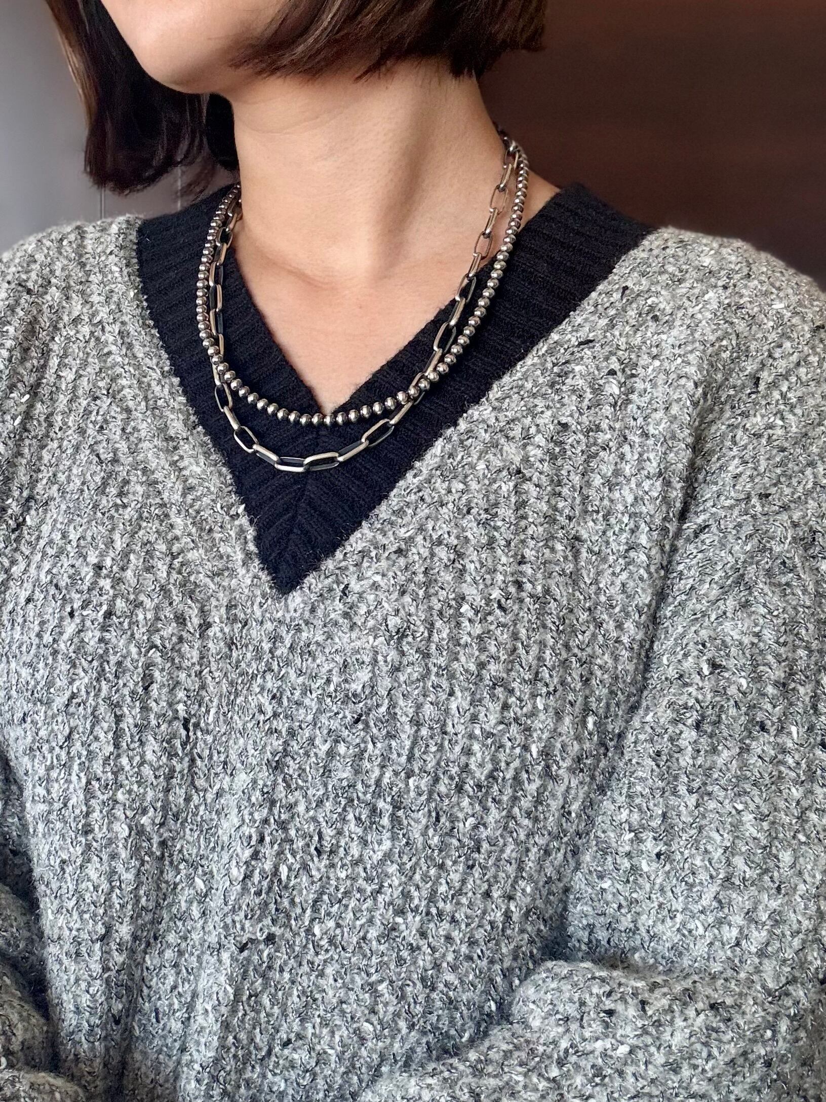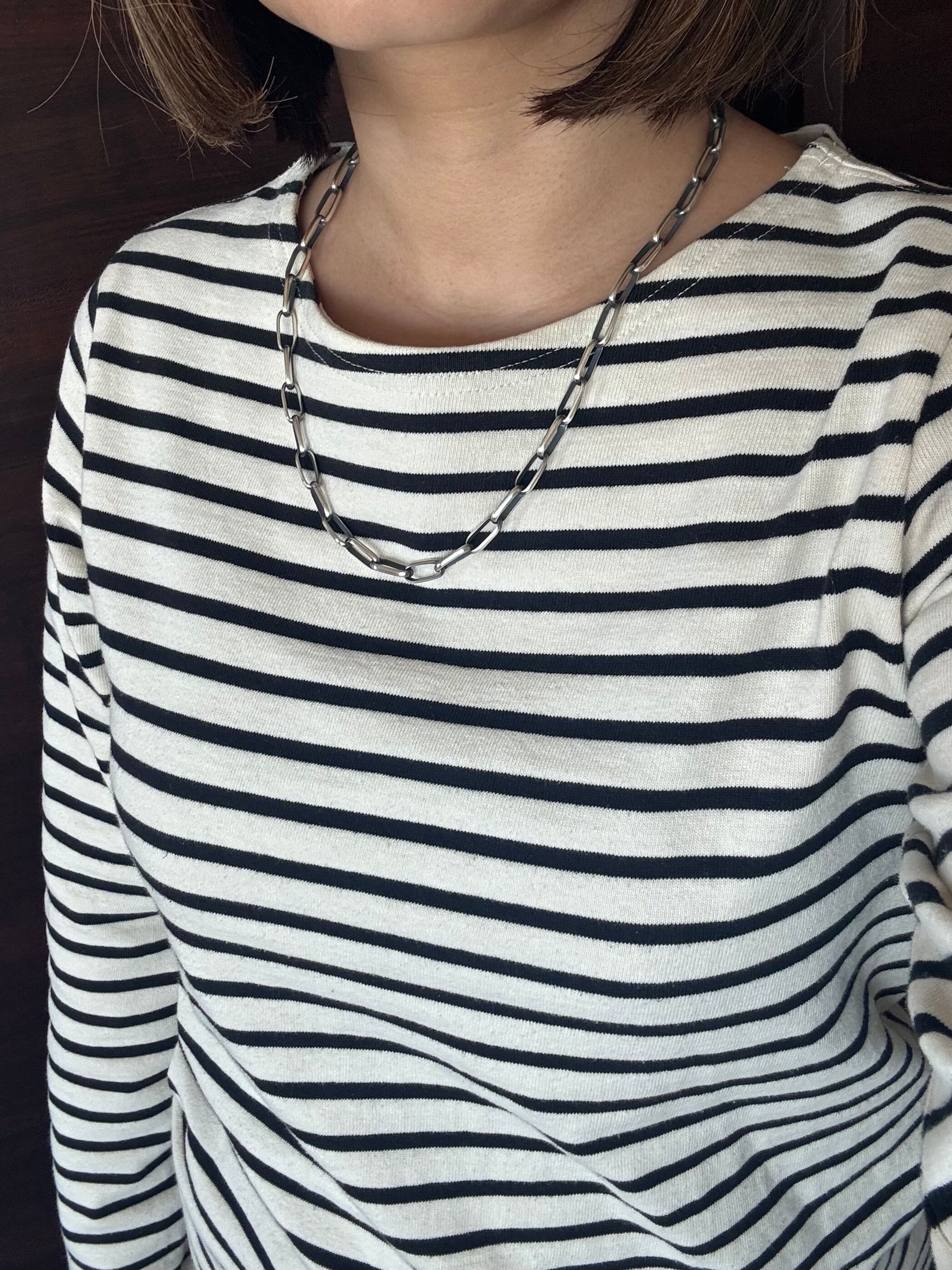 シンプルで洗練されたスタイルを演出する存在感のあるシルバーチェーンネックレス。