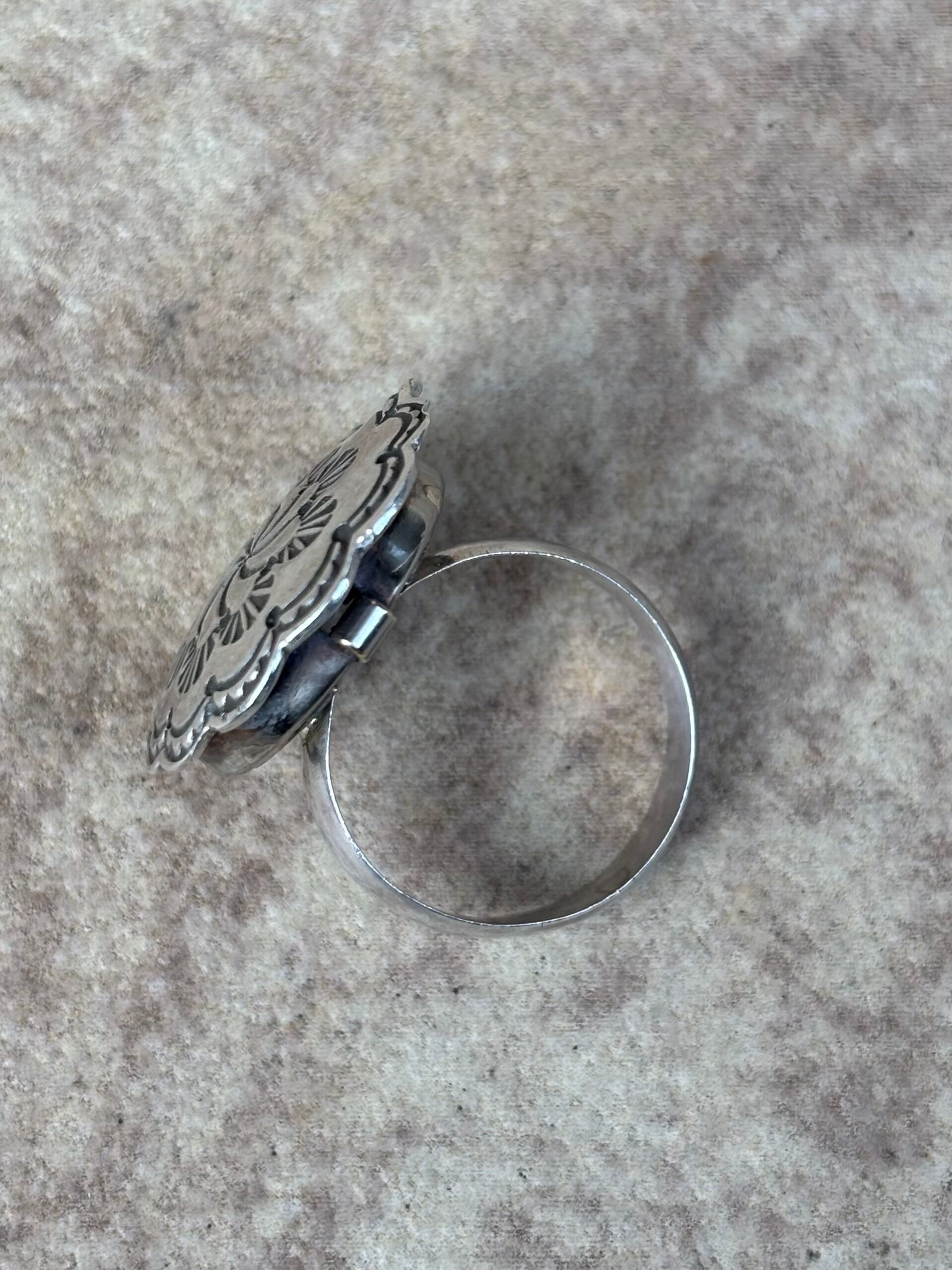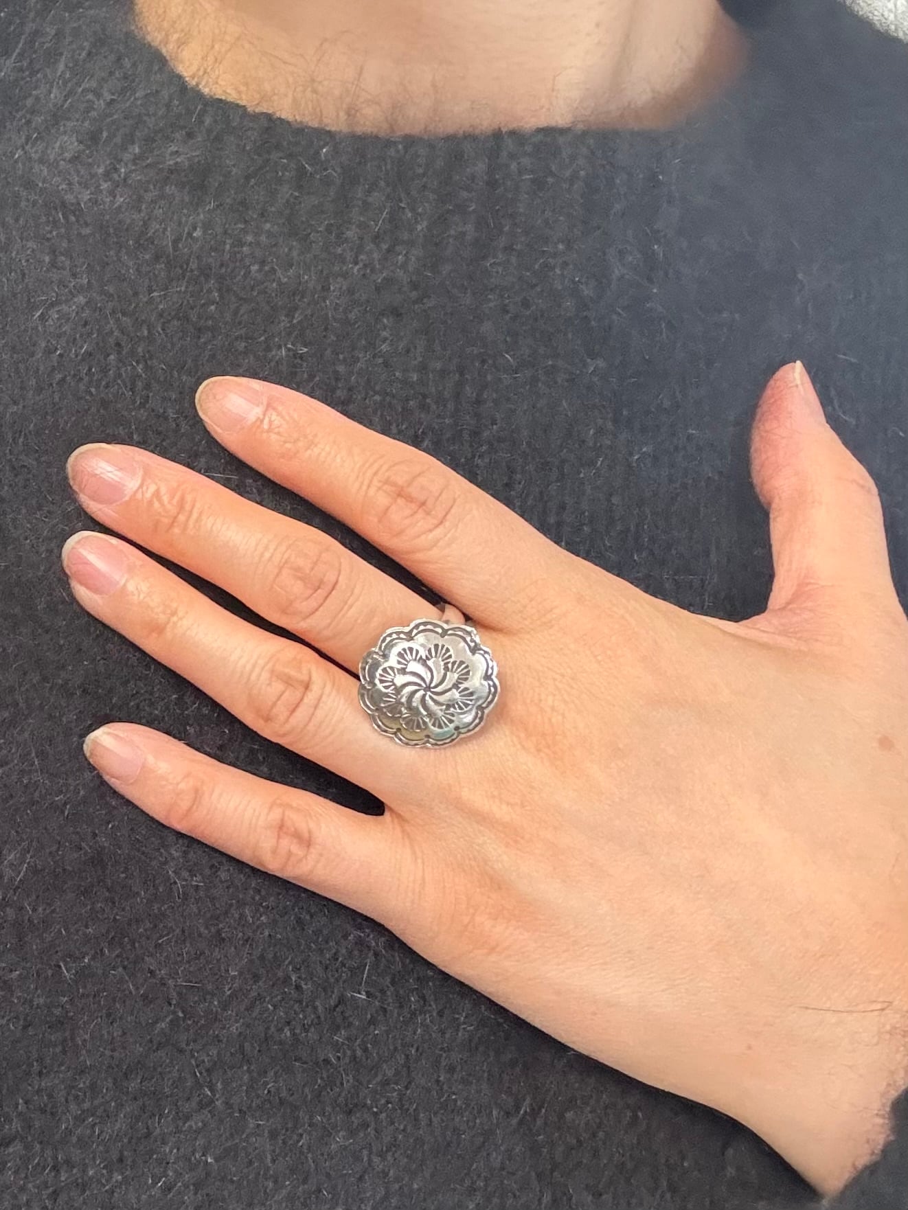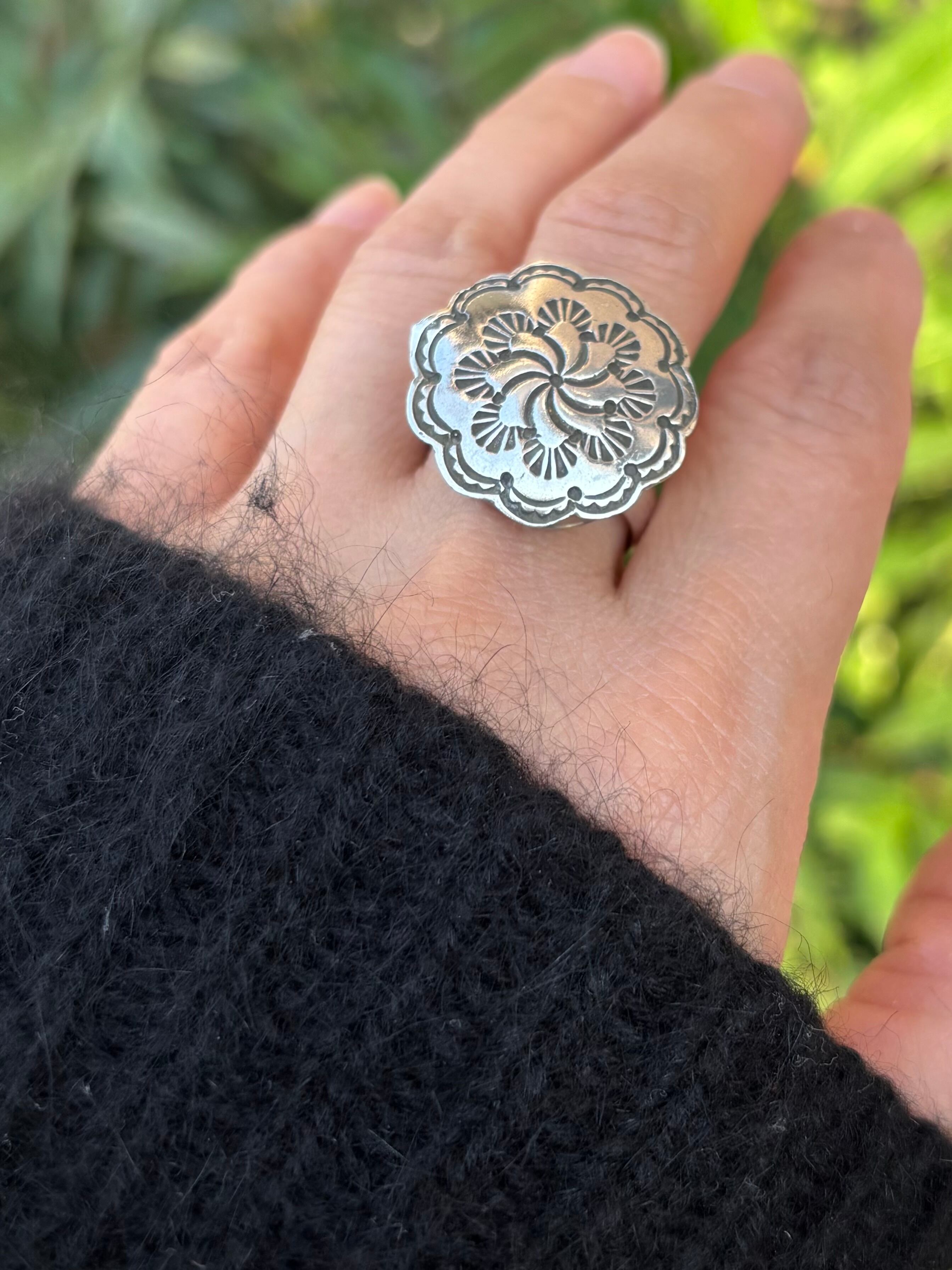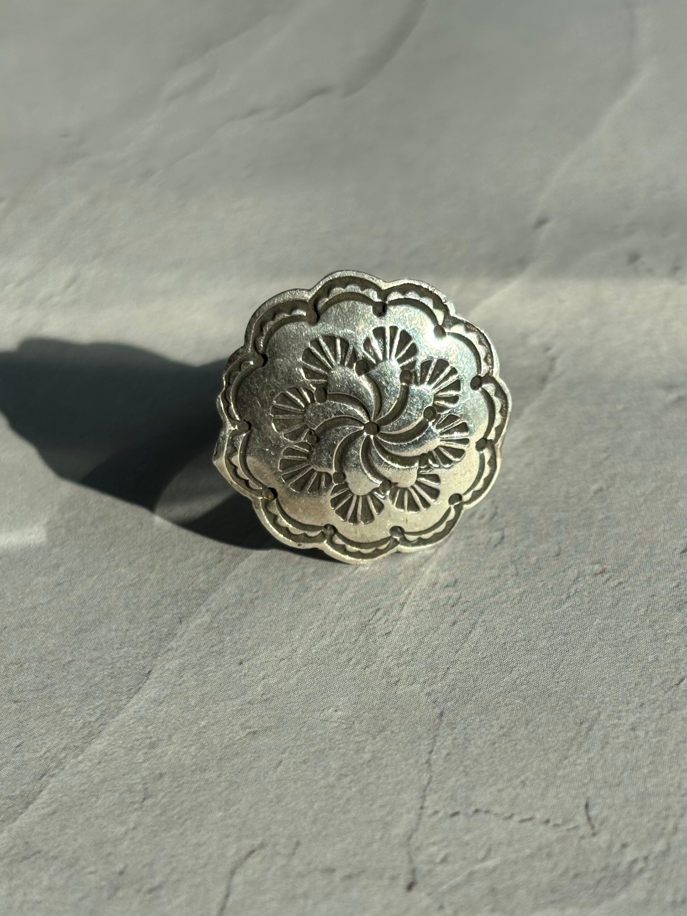 うずまきのようなスタンプワークと、花びらのような形がカッコ可愛いリング。