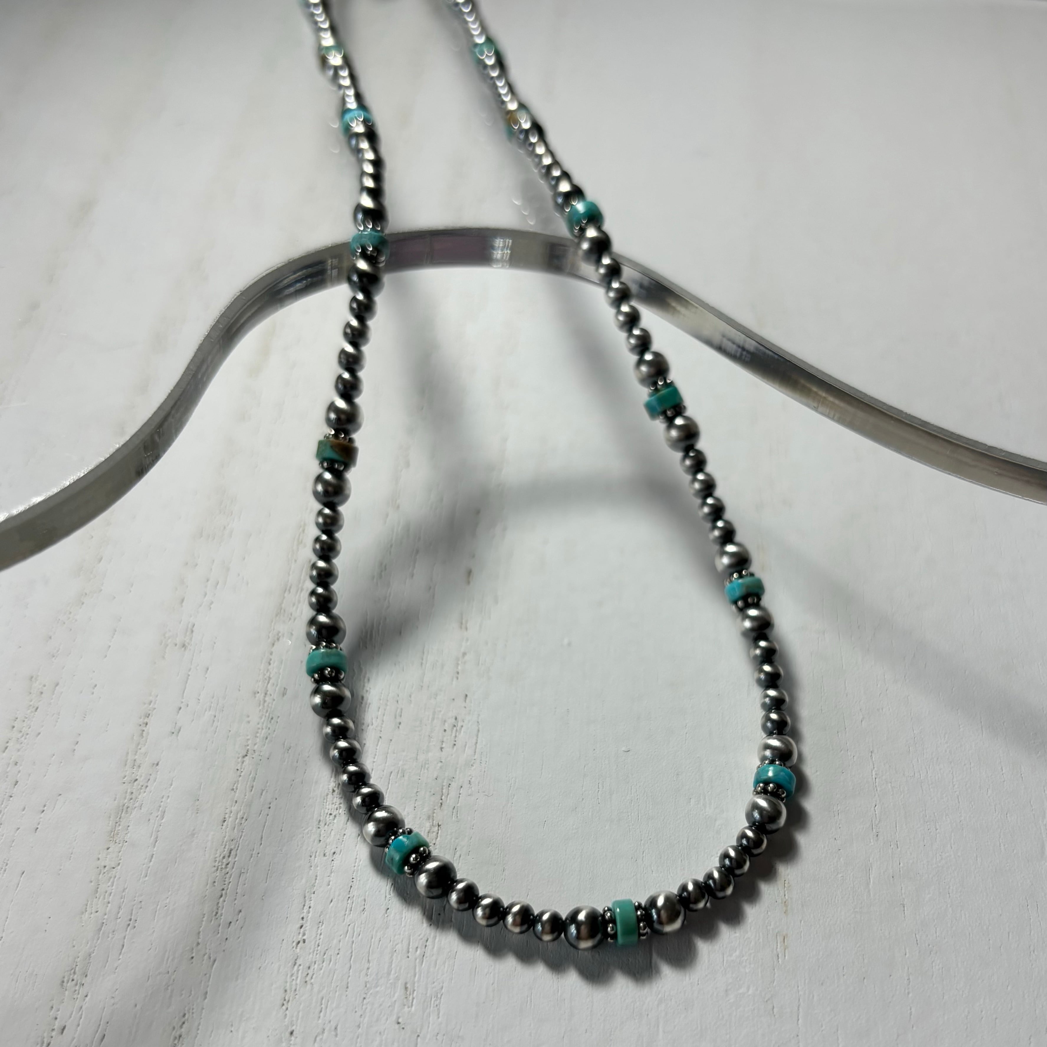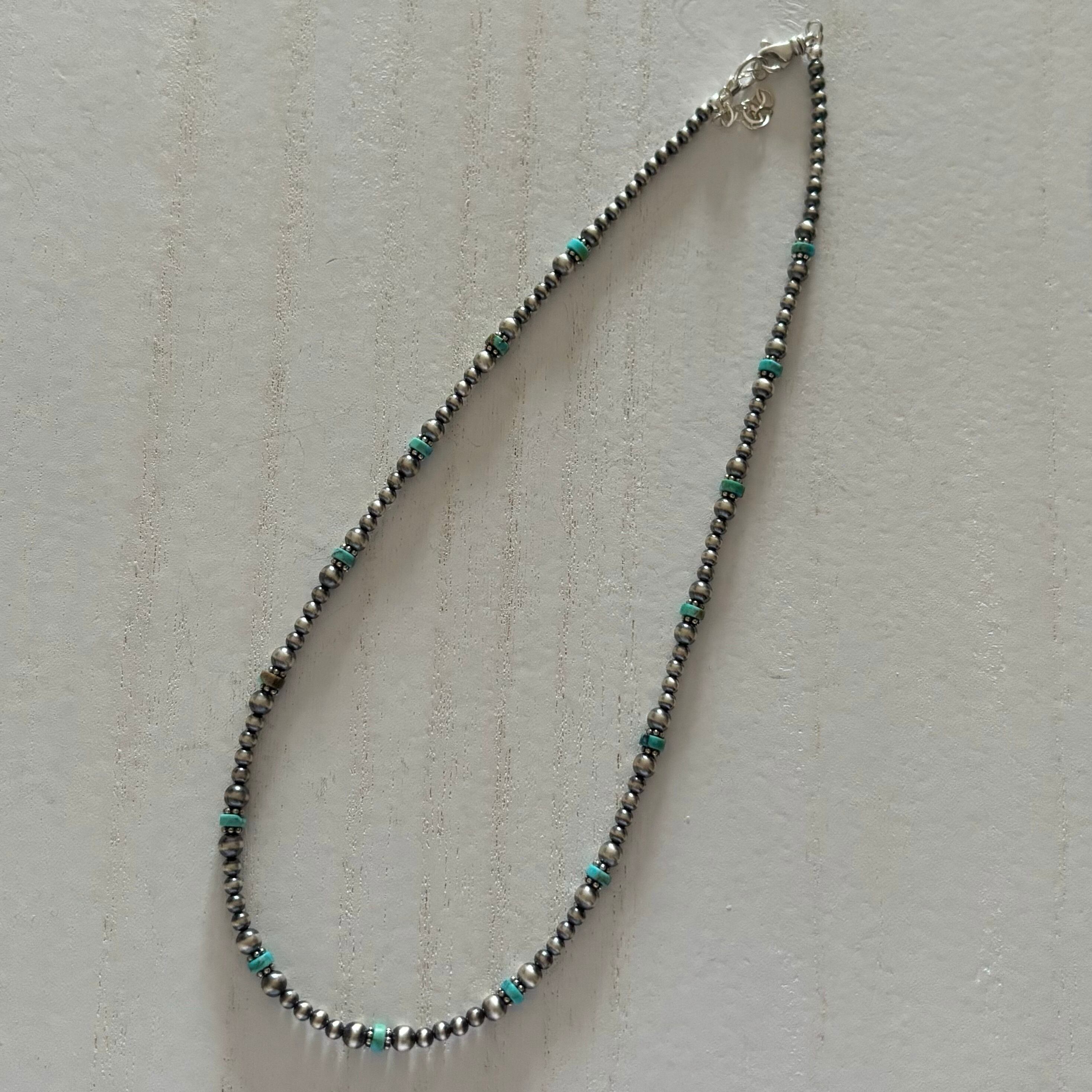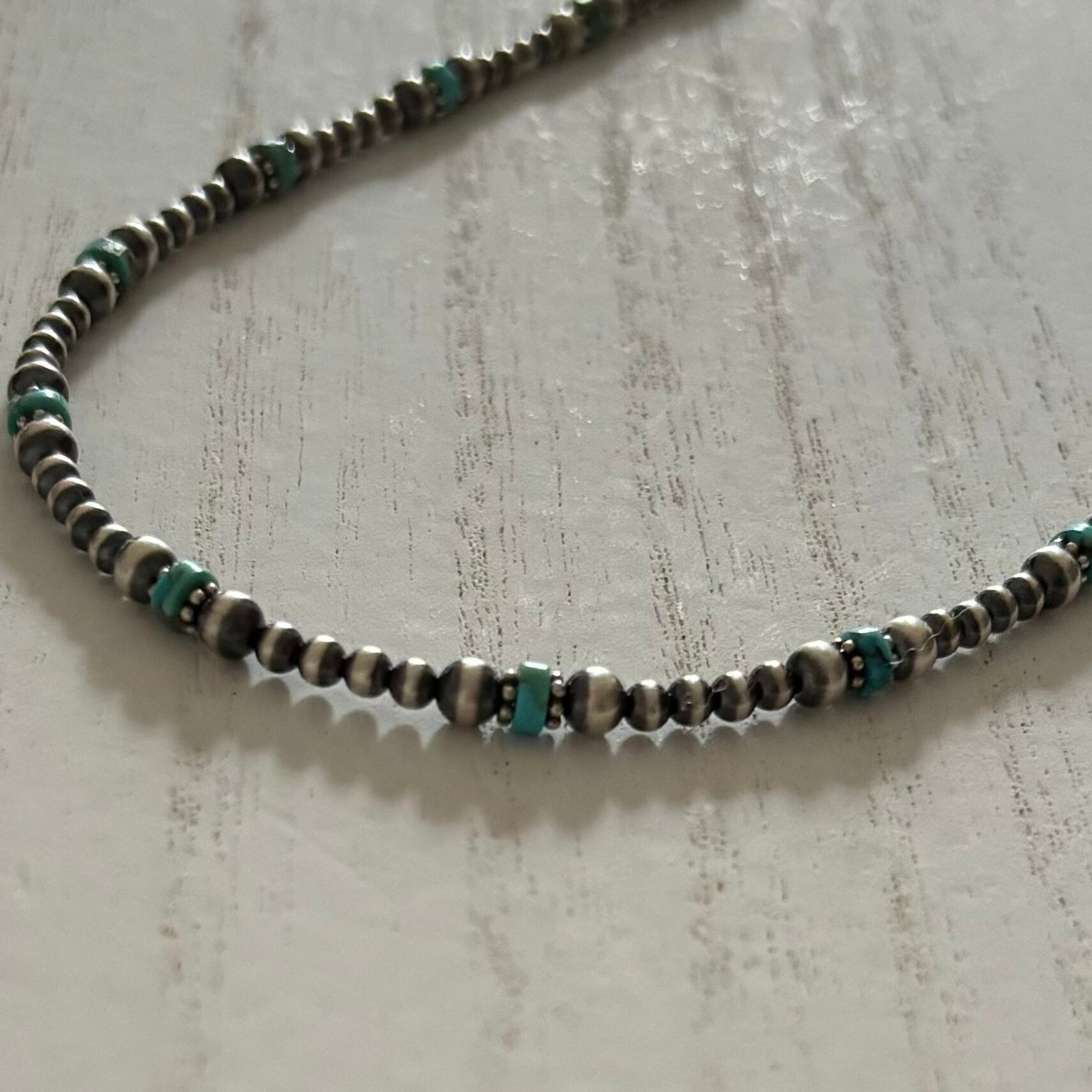 一つひとつの色合いが異なるナチュラルターコイズといぶし銀ナバホパールをミックスしたネックレス。