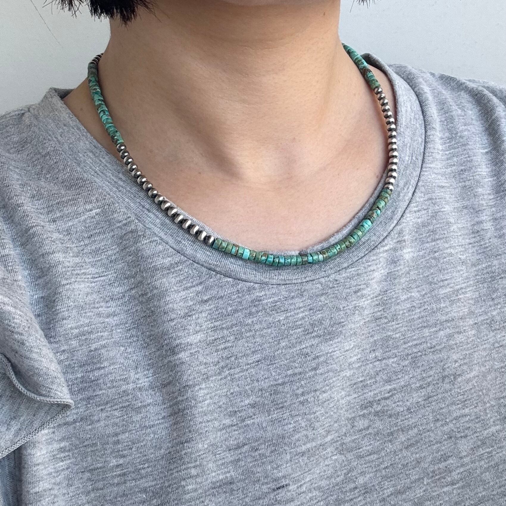パッと目を引く個性的なターコイズヒシとクールなナバホパールをミックスしたネックレス。