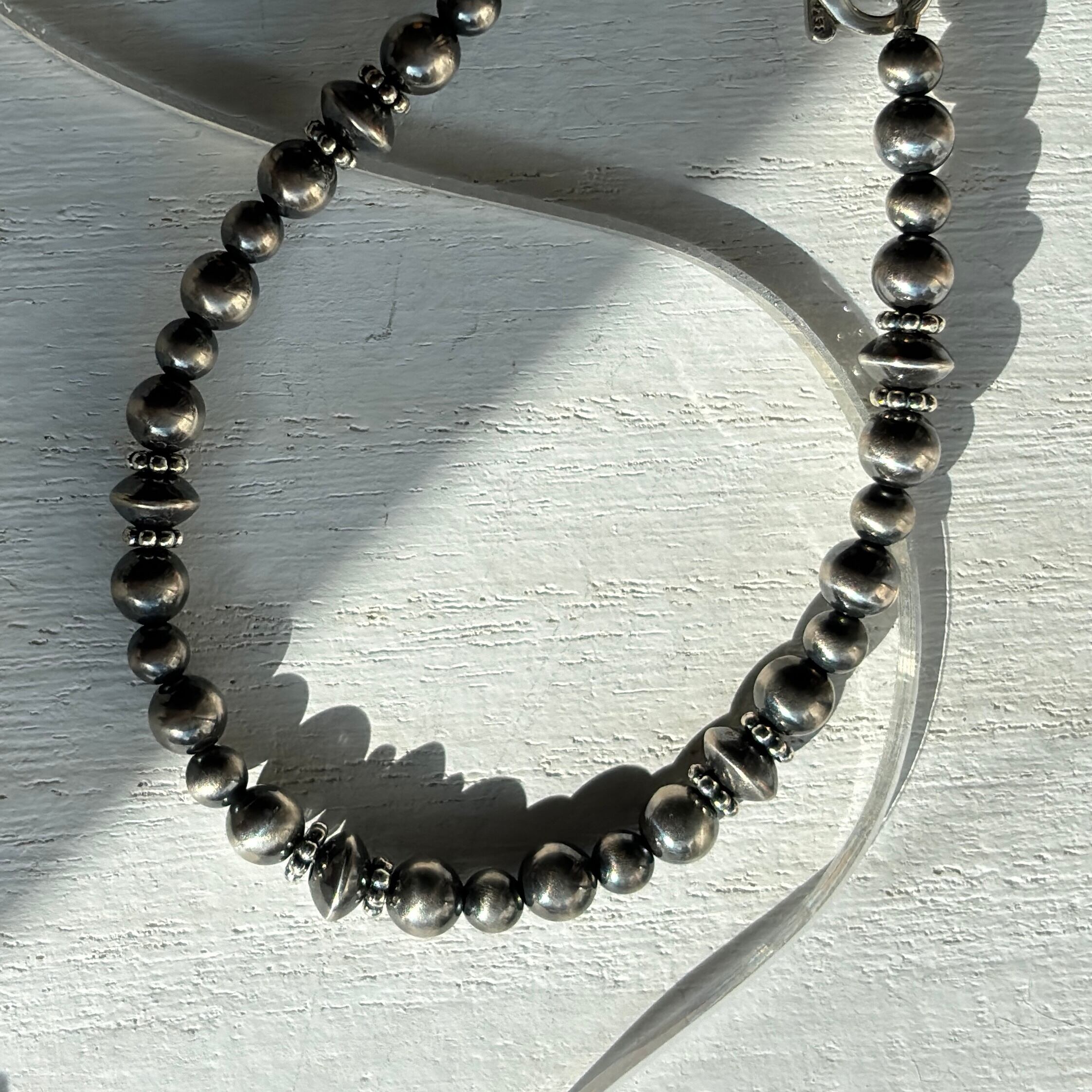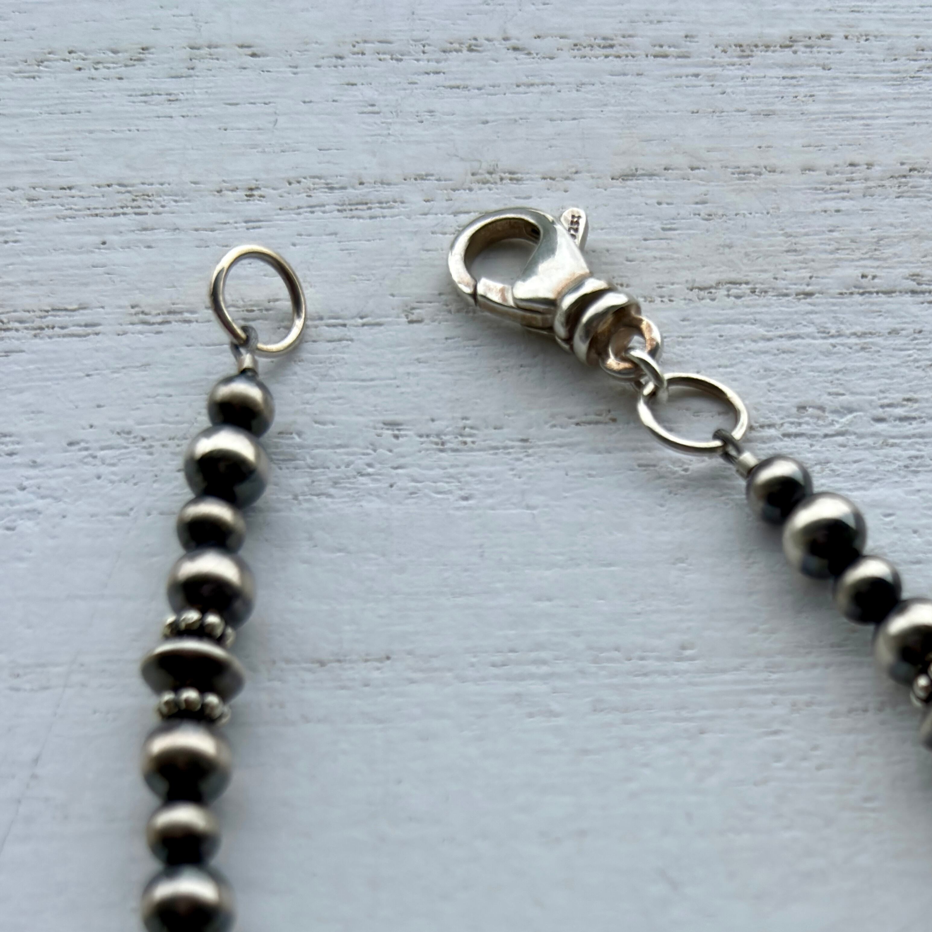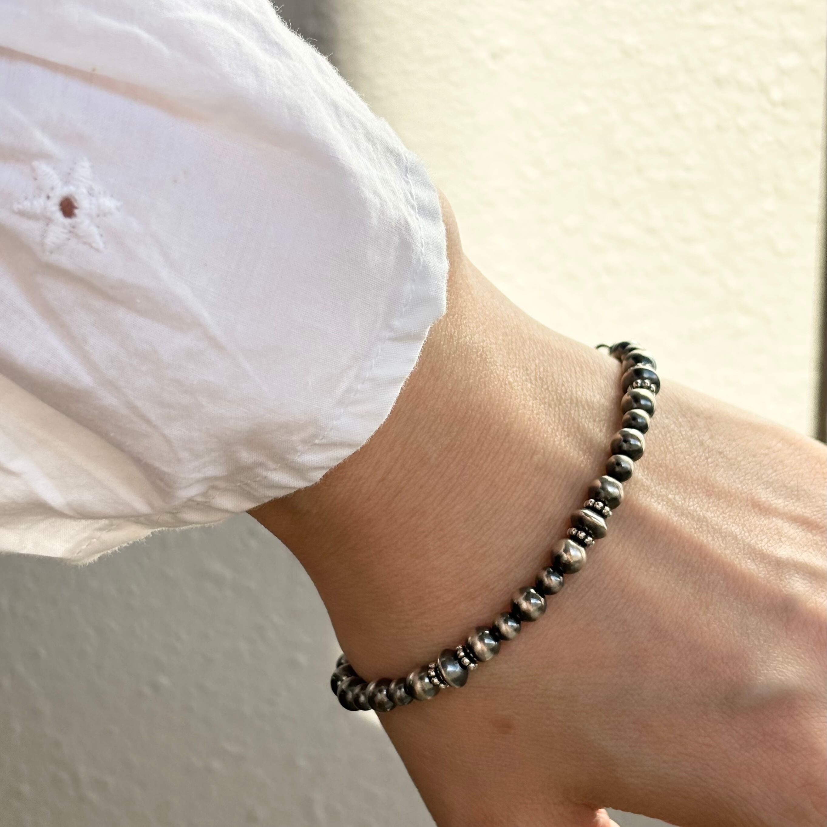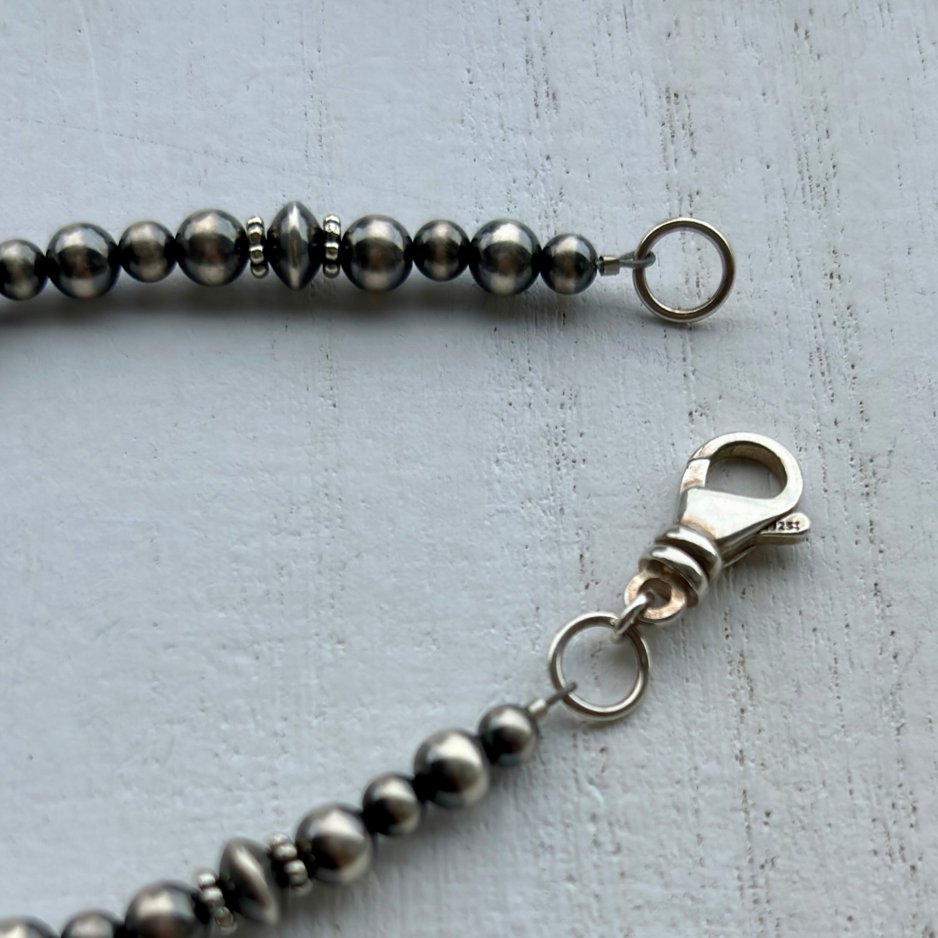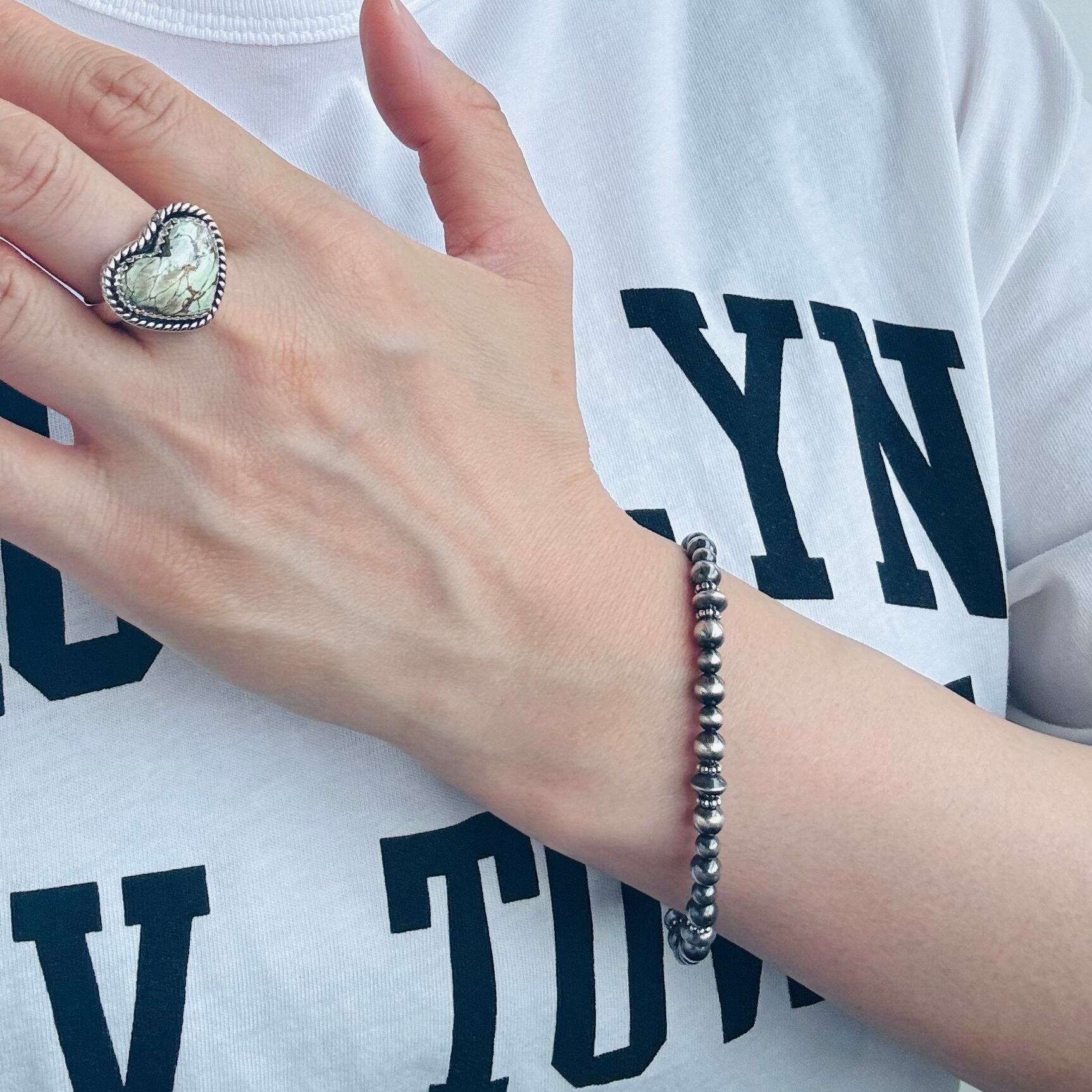 等間隔に置かれたそろばん珠がクールさをプラスしてくれ、さらにその両脇にあしらわれたギザギザのバリスタイルビーズがより洗練された印象を与えてくれます。