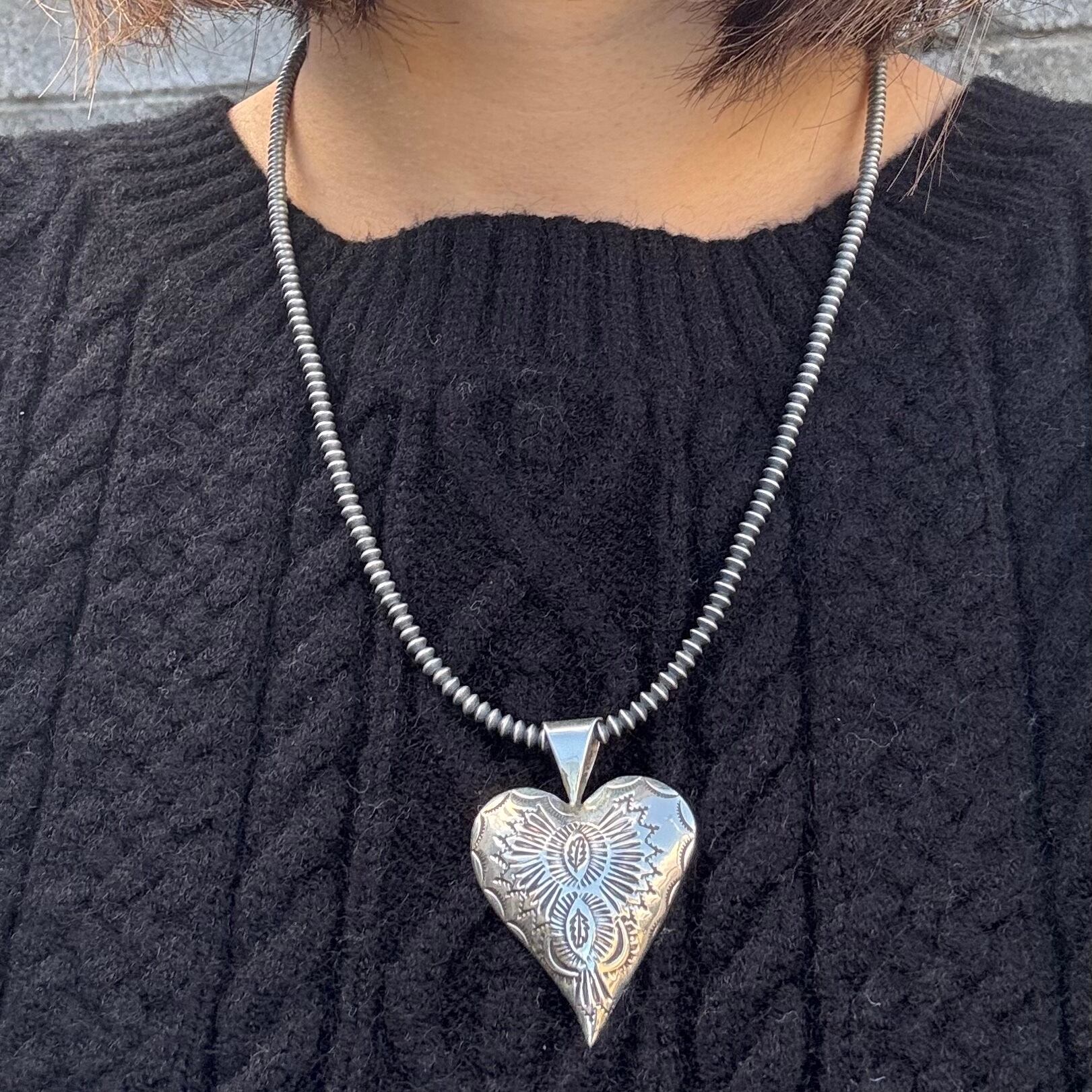 大ぶりの手彫り模様のハートが、唯一無二の存在感を放ってくれ、シンプルコーデのポイントに。